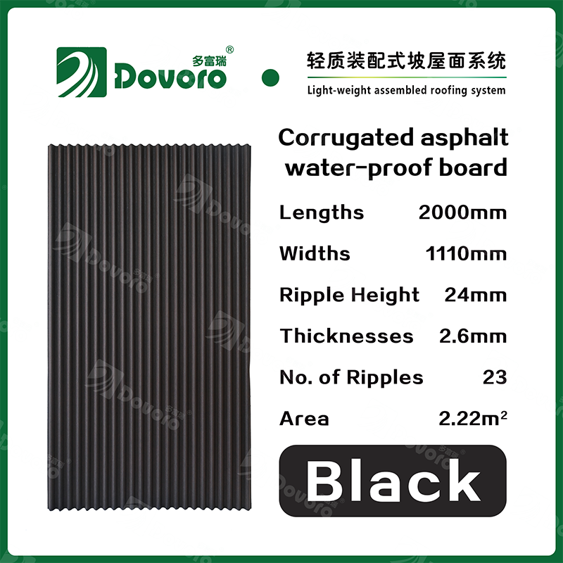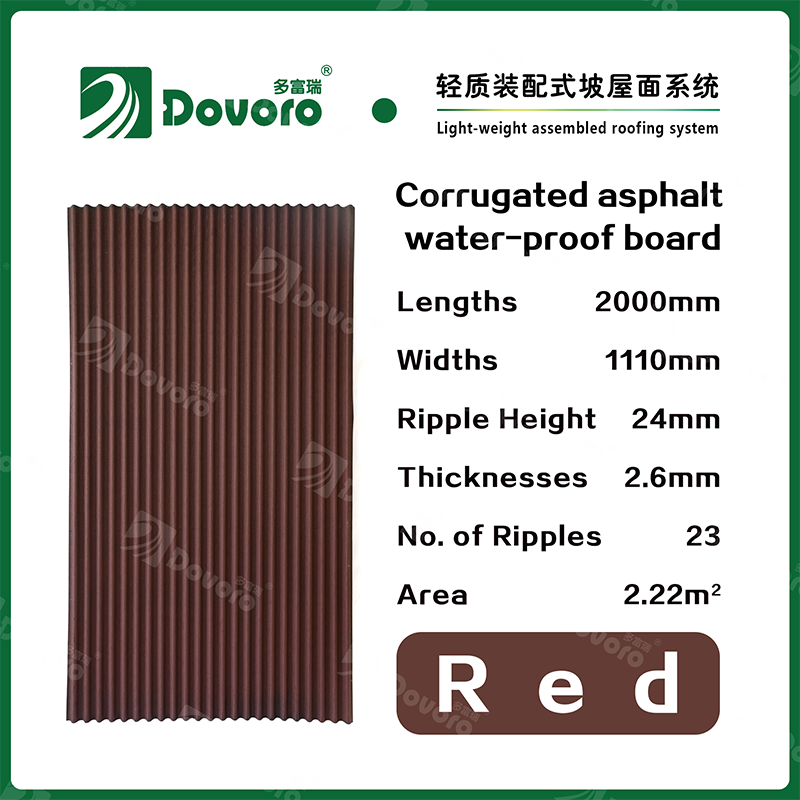 The Dovoro corrugated asphalt water-proof board is the lower layer of various tile materials, which has functions such as waterproofing, breathability, insulation and dehumidification. It is easy to cooperate with other insulation materials and roof tiles, not only reducing the total cost of roof engineering, but also making construction simpler, thus ensuring the quality of roof engineering.