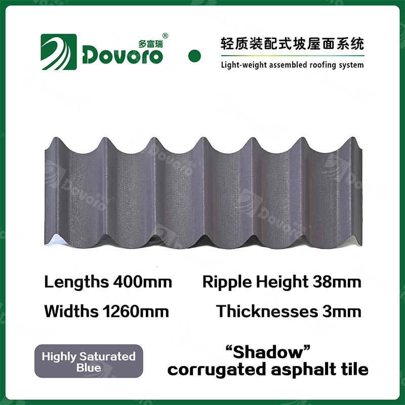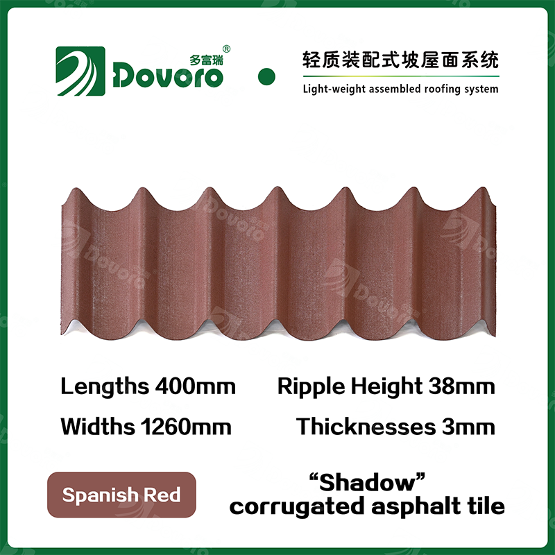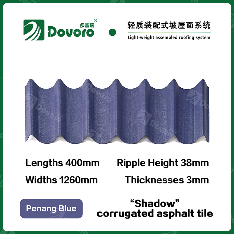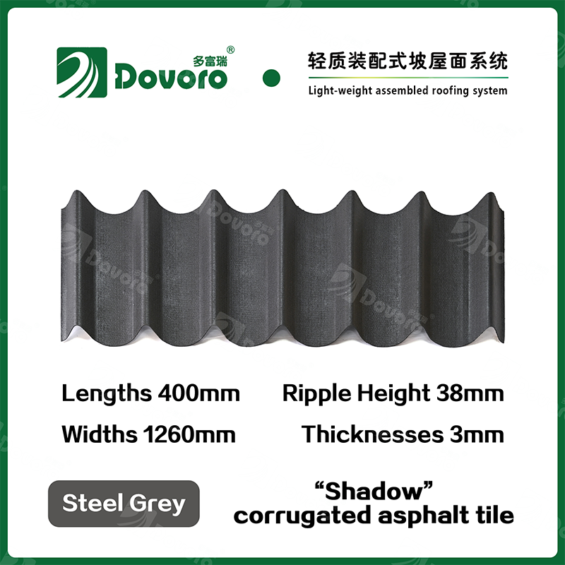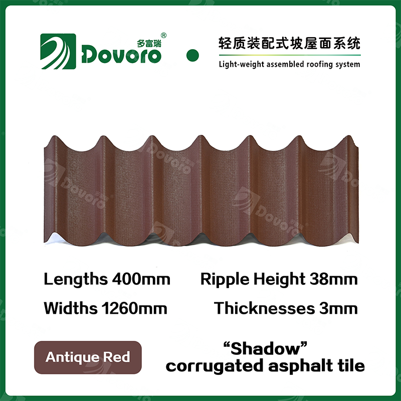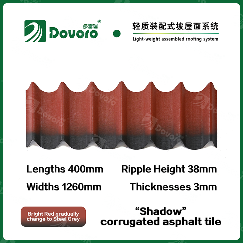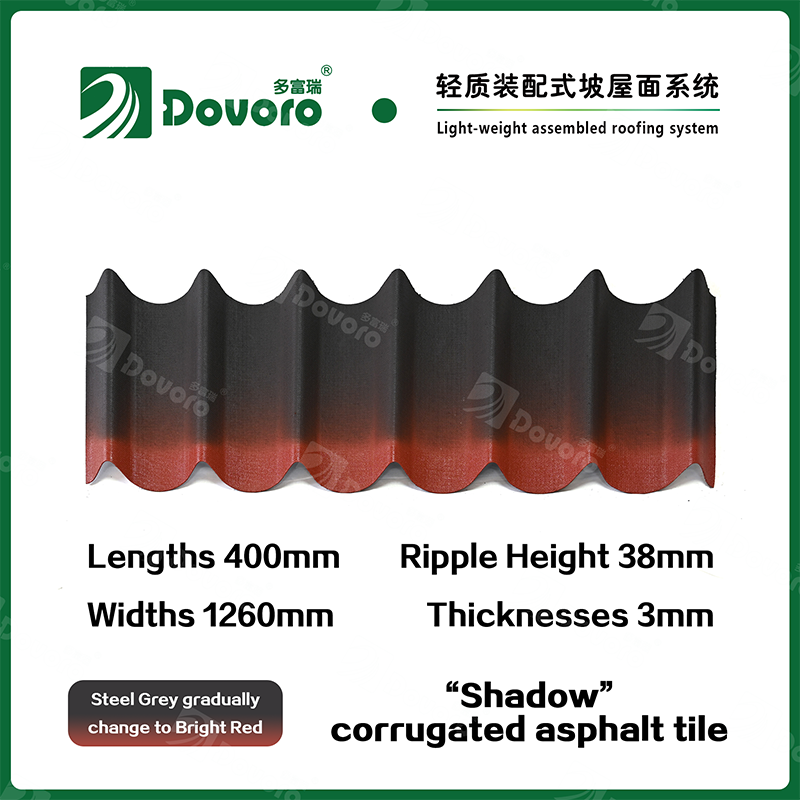 Dovoro “Shadow” corrugated asphalt tile is made of mineral plant fibers soaked in asphalt. The one-time formed base plate is impregnated in asphalt at high temperatures, making the tile more solid as a whole; The thermosetting resin ensures strength and stiffness of tile; Imported raw materials, in combination with advanced coloring technology, ensure long-lasting color, and the mixed color spraying process makes the tile elegant in appearance, beautiful in colors, and stereoscopic in texture.