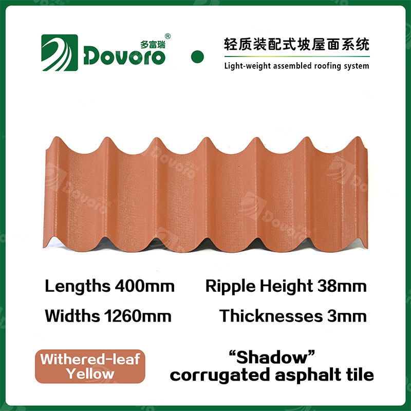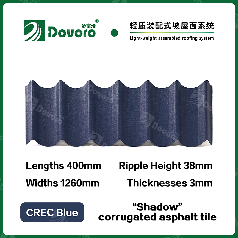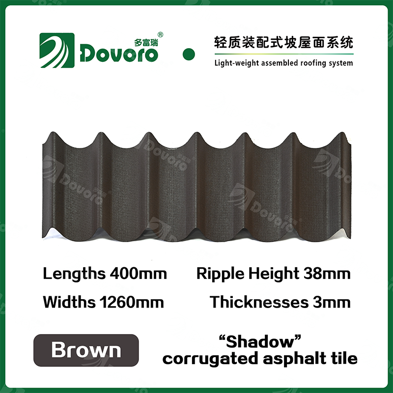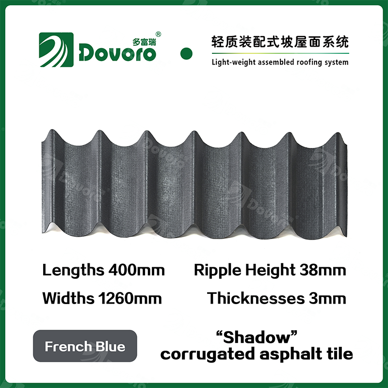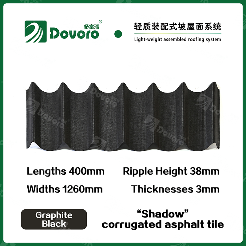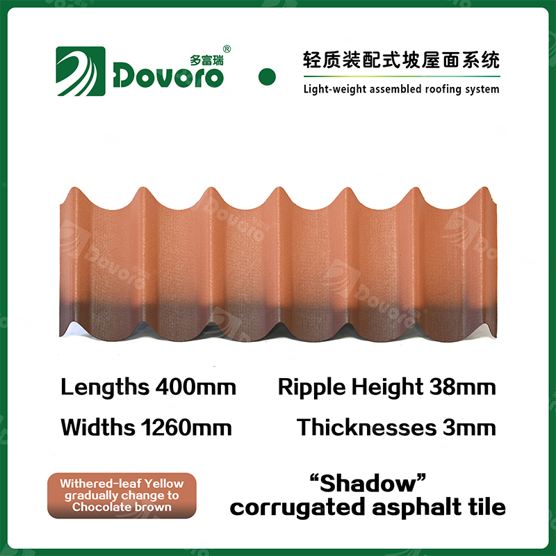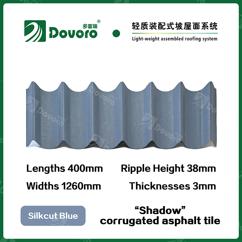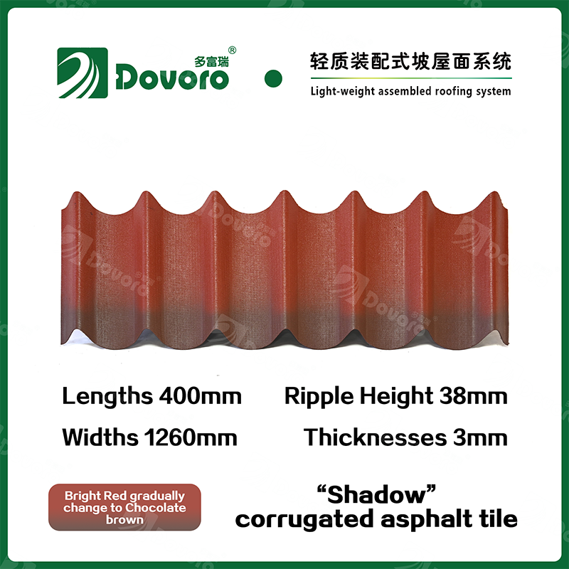 Dovoro “Shadow” corrugated asphalt tile is made of mineral plant fibers soaked in asphalt. The one-time formed base plate is impregnated in asphalt at high temperatures, making the tile more solid as a whole; The thermosetting resin ensures strength and stiffness of tile; Imported raw materials, in combination with advanced coloring technology, ensure long-lasting color, and the mixed color spraying process makes the tile elegant in appearance, beautiful in colors, and stereoscopic in texture.