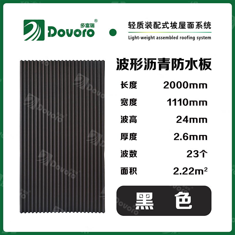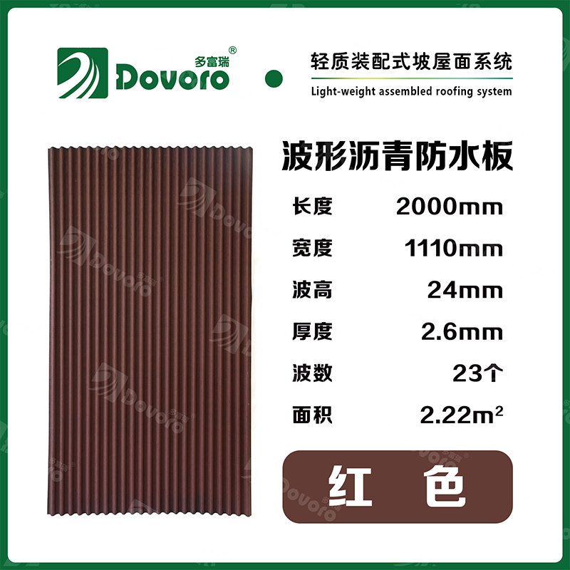 多富瑞波形瀝青防水板作為各種瓦材的下覆層,真正起到了防水、透氣、隔熱和除濕的作用。便于和其他保溫材料、屋面瓦配合,不僅降低了屋面工程的總造價,也使施工變得更加簡單,因此屋面工程質量更加有保證。
