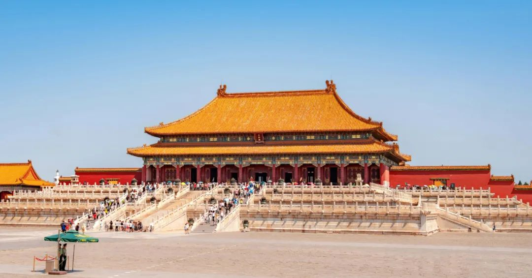 廡殿頂是古建筑中等級最高的一種屋頂形式,多應用于宮殿和寺廟,是皇權與神權的體現。在實際上,廡殿頂已經成為中國古代皇家建筑獨有的一種屋頂形式。在瓦的選擇上,多為琉璃瓦,顏色以金色為主。