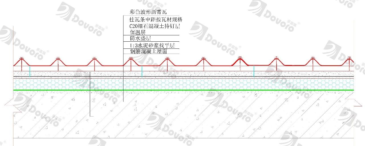 在項目的屋面改造設計中,屋面構造由下而上依次為水泥基層、找平層、防水卷材、保溫層、持釘層、掛瓦條、幻彩波形瀝青瓦。波形瀝青瓦每平僅約3kg的重量,減輕老舊住宅屋面承重負擔;屋面構造間采用物理連接,大大提升施工效率,減少施工周期,降低屋面改造對居民生活的影響。