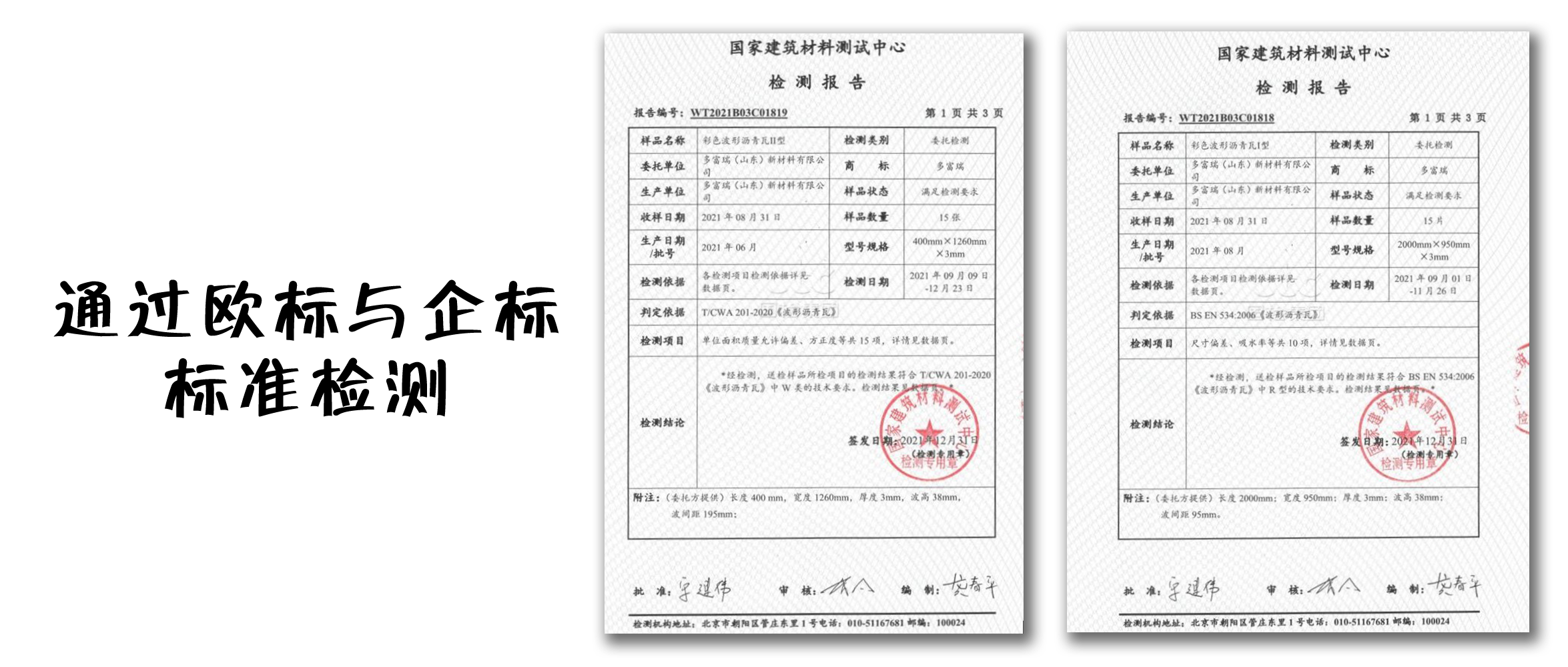 在多富瑞內(nèi)部,從原材料到半成品到成品,均有嚴(yán)苛的檢測(cè)標(biāo)準(zhǔn)。保障用戶收到的每一片瓦材,都有著最佳的防水性能。
