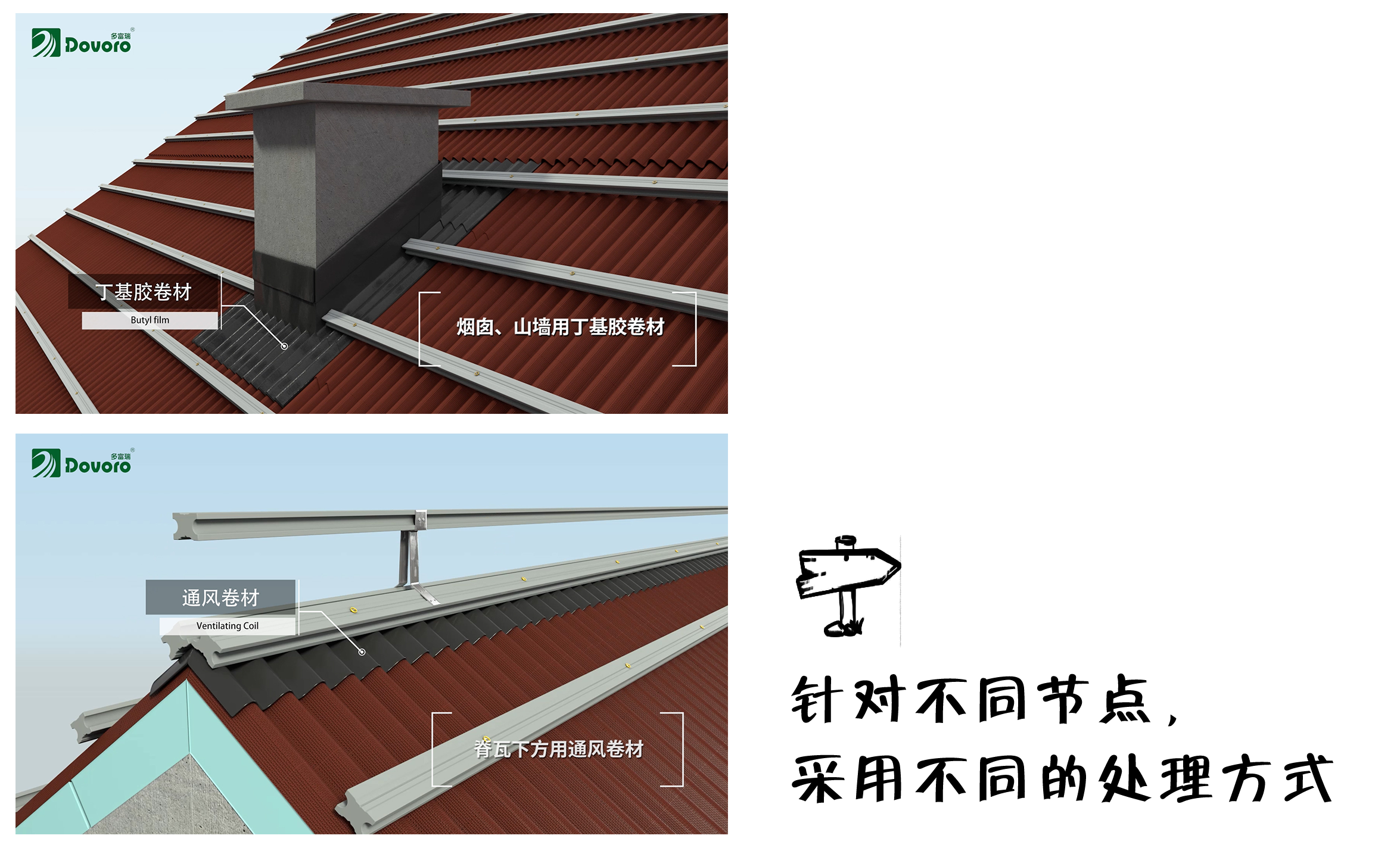 多富瑞精心設(shè)計(jì)了不同位置的節(jié)點(diǎn)處理方式,如屋脊、天溝、煙囪等位置,使用防水卷材或通風(fēng)卷材輔助防水。無(wú)需像傳統(tǒng)坡屋面需要大量使用防水卷材,僅在部分位置加強(qiáng)防水性。