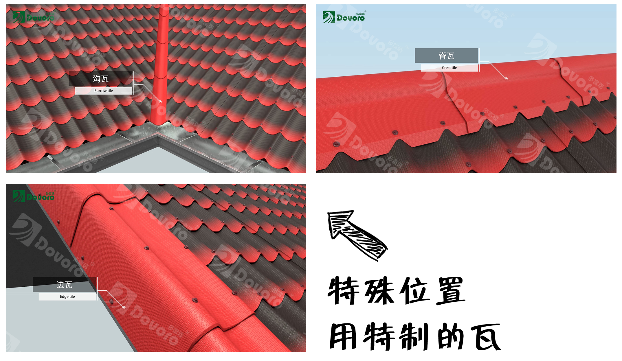 脊瓦、溝瓦、檐口瓦等針對(duì)特殊位置的專用波形瀝青瓦,可使不同角度瓦材之間也可以嚴(yán)絲合縫。