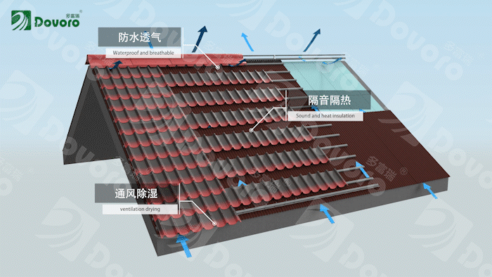 由于有通風通道的存在,也因為空氣的導熱系數很低,整個屋面的瓦材與防水板之間,除了掛瓦條以外幾乎沒有直接接觸,可以達到隔熱的效果。