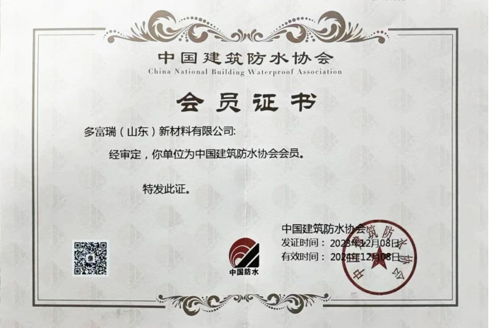 5月,憑借高質量的產品和服務正式成為中國建筑防水協會會員,多富瑞十年如一日,在防水領域的精耕細作,致力于推動防水行業高質量發展,為用戶提供更加優秀的解決方案。