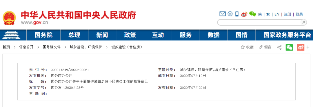 2020年7月20日國務院辦公廳發布《關于全面推進城鎮老舊小區改造工作的指導意見(國辦發〔2020〕23號)》,指導意見中指出城鎮老舊小區改造是重大民生工程和發展工程,對滿足人民群眾美好生活需要、推動惠民生擴內需、推進城市更新和開發建設方式轉型、促進經濟高質量發展具有十分重要的意義。