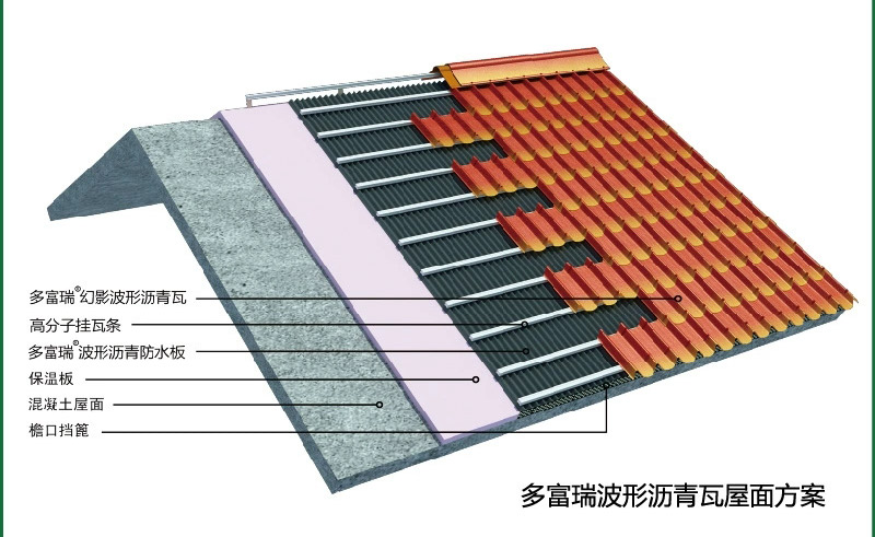 防水板是由植物纖維、礦物纖維和瀝青結合而成的復合新型波形防水材料,除自身具備防水性能外,還起到通風、除濕等輔助作用,最重要的是在不影響自身性能的前提下把混凝土基層、保溫層和屋面瓦快速有效地整合起來。