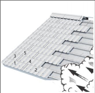 應從檐口處開始逐排鋪設,平行于屋脊的搭接應逆該地區年主導風向,垂直于屋脊的搭接,應順水流方向,上下兩排波形瀝青瓦應錯縫排列。