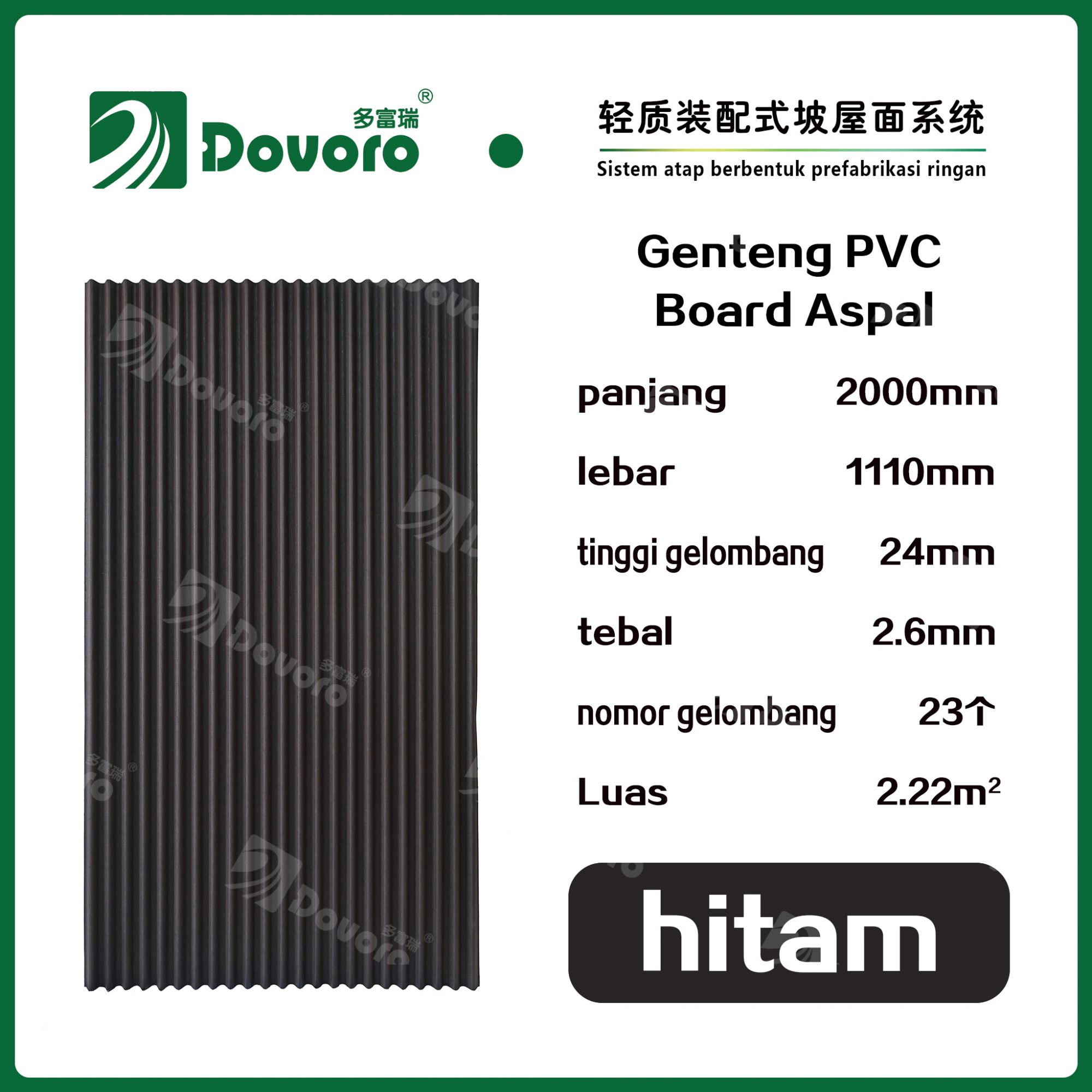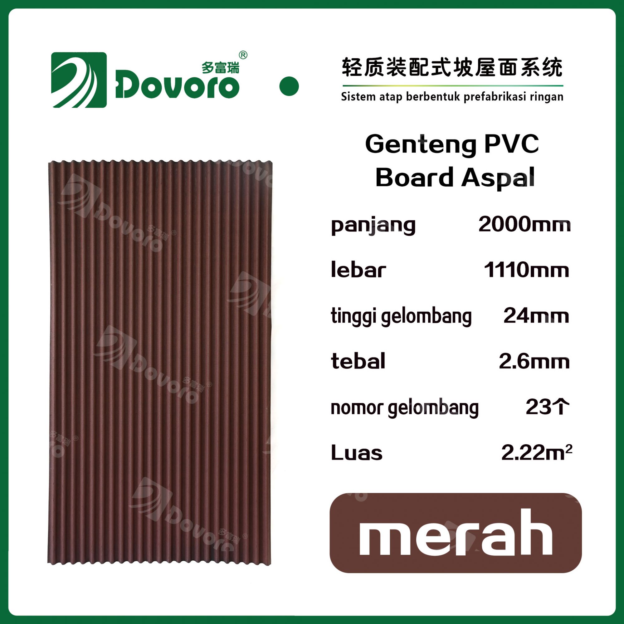 Genteng PVC Board Aspal adalah lembaran serat mineral berkualitas tinggi yang dicelupkan dalam aspal pada suhu dan tekanan tinggi. Karena dibentuk pada suhu tinggi, memiliki kekuatan tekan yang tinggi dan kinerja anti-air yang luar biasa, serta awet.